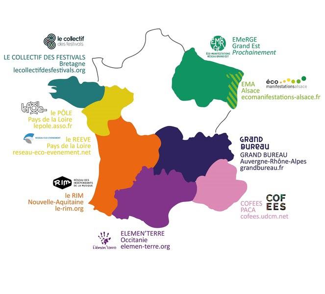 Les huit membres ancrés sur le territoire s’impliquent activement pour encourager la transition écologique dans le secteur de l’événementiel, et donc celui de l’industrie musicale par le biais du live. On y retrouve Éco-Manifestations Alsace (EMA) qui lance le projet régional Éco-Manifestations Réseau Grand-Est (EMeRGE), Le Collectif des festivals en Bretagne, le Réseau éco-événement (REEVE) et Le Pôle en Pays de la Loire, le Réseau des indépendants de la musique (RIM) en Nouvelle-Aquitaine, Grand Bureau en Auvergne Rhône-Alpes, Élémen’terre en Occitanie et Collectif des Festivals écoresponsables et solidaires (COFEES) en PACA.