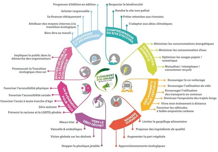 On a voulu faire des documents transparents et lisibles. Il y a une roue du référentiel qui décrit ce que pour nous est un événement éco-engagé. Il est accessible à tous. Le guide est loin d’être finalisé mais on a préféré diffuser une version temporaire que rien du tout.”