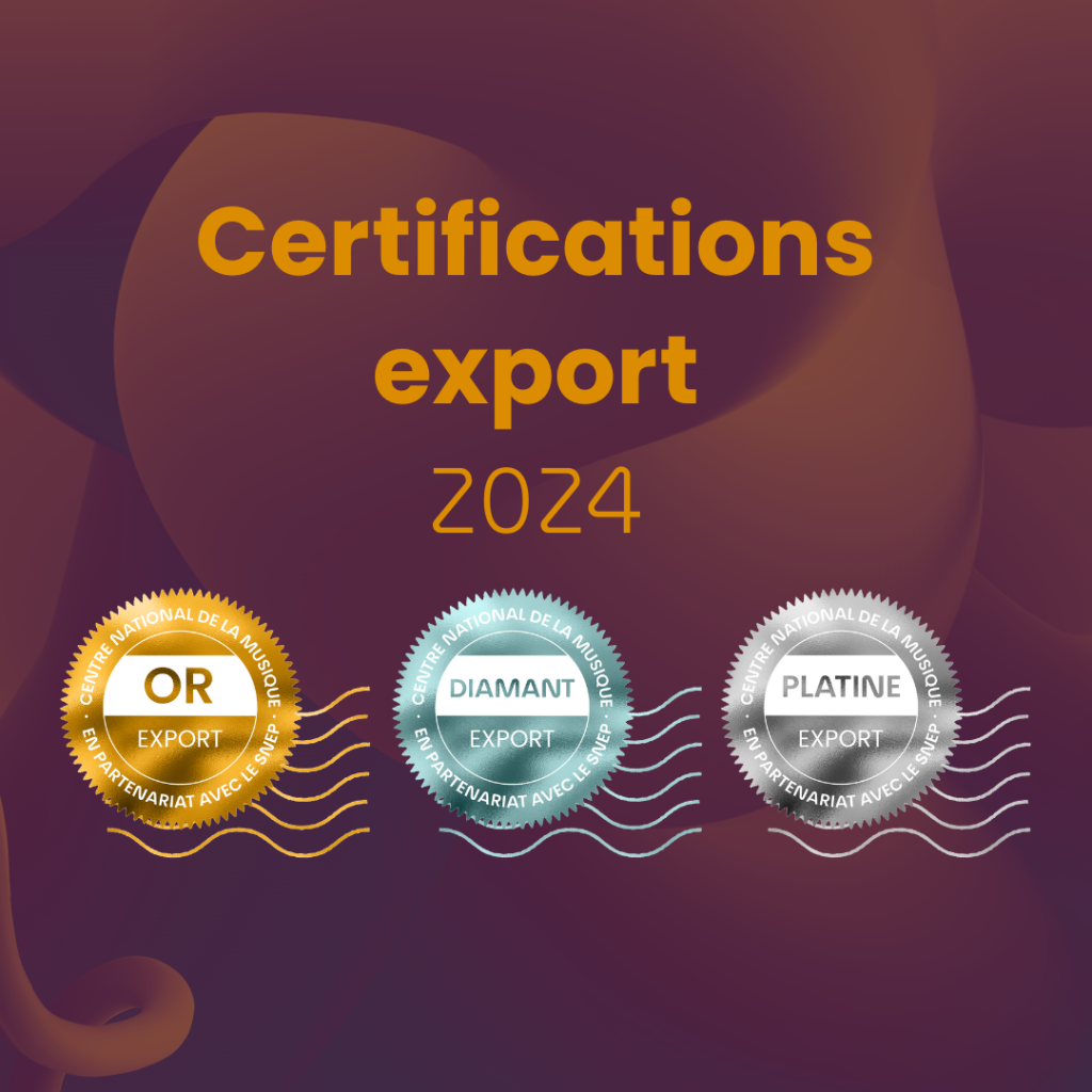Les certifications export 2024 prennent en compte les ventes physiques et/ou digitales réalisées hors France au 31 décembre 2024. Elles concernent tous les singles ou albums sortis entre le 01-01-2024 et le 31-12-2024 OU sortis antérieurement et ayant atteint un seuil « certifiable » durant ladite période.
