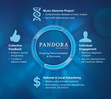 « Dans la mythologie grecque antique, Pandore a reçu beaucoup de dons des dieux, y compris le don de la musique par Apollon. Elle était aussi très curieuse, comme nous le savons tous. Contrairement aux dieux de l’époque, nous célébrons cette vertu et nous nous sommes donné pour mission de récompenser ceux qui sont curieux de musique en leur offrant une expérience sans fin de découverte musicale », indique sur son site la compagnie, qui est devenue Pandora Media. Le succès est immédiat. D’autant que le modèle de l’abonnement, d’abord privilégié, laisse la place à un accès gratuit financé par la publicité. « Les choses ont décollé comme une fusée. Nous avions plus de 10 000 personnes qui venaient s’inscrire chaque jour, alors que nous n’avions fait aucune publicité pour le service », confiera plus tard Tim Westergren.