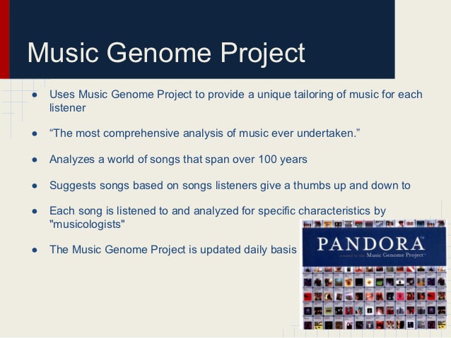 Dans le Music Genome Project de Pandora, les chansons rock et pop ont 150 gènes, les chansons rap en ont 350, et les chansons ou morceaux de jazz en ont environ 400. D’autres genres musicaux, comme les musiques du monde et la musique classique, ont entre 300 et 450 gènes. Plus il y a de gènes, plus la recommandation, qui consiste chez Pandora à déterminer quels titres se rapprochent le plus d’une chanson source pour les intégrer à une playlist, a des chances d’être pertinente. Afin de nuancer encore plus l’analyse, chaque gène se voit assigner un nombre compris entre 0 et 5 par incrément d’un demi-point, ce qui permet de définir son poids dans le génome d’une chanson. En précisant plus finement, par exemple, son degré de gaîté ou de tristesse.