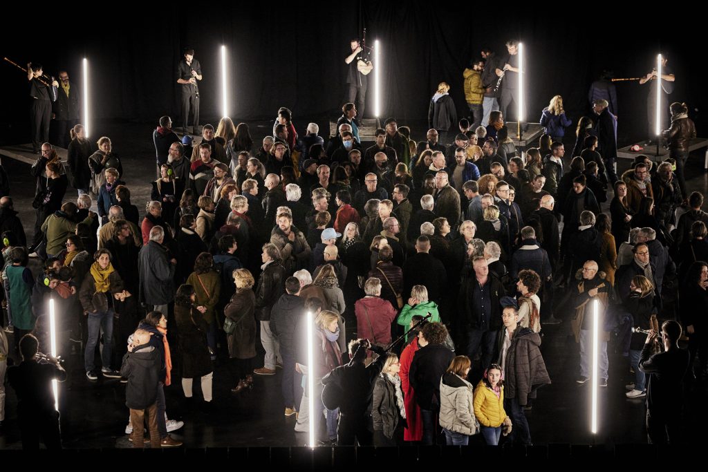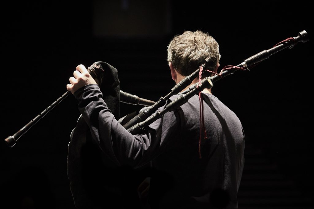 An immersive version of Terry Riley’s famous piece IN C, performed by 20 pipers surrounding the audience.