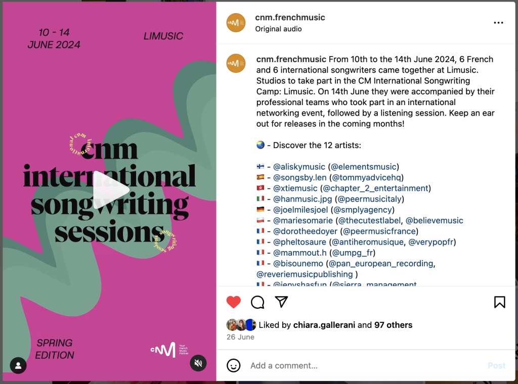Suite à un appel à projets, lancé par le Centre national de la musique, six artistes, auteurs/autrices, compositeurs/compositrices, topliners, producteurs/productrices français ont été sélectionnés pour participer aux CNM International Songwriting Sessions, aux côtés de six auteurs/autrices-compositeurs/compositrices internationaux. Cette rencontre a lieu du 10 au 14 juin 2024 dans les studios de Limusic à Limoux.